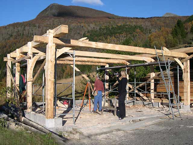 All four frames are in upright position and the roofcarrying beams are lifted into place. Now the posts are nivelled before the roofcarryers are fitted into place.