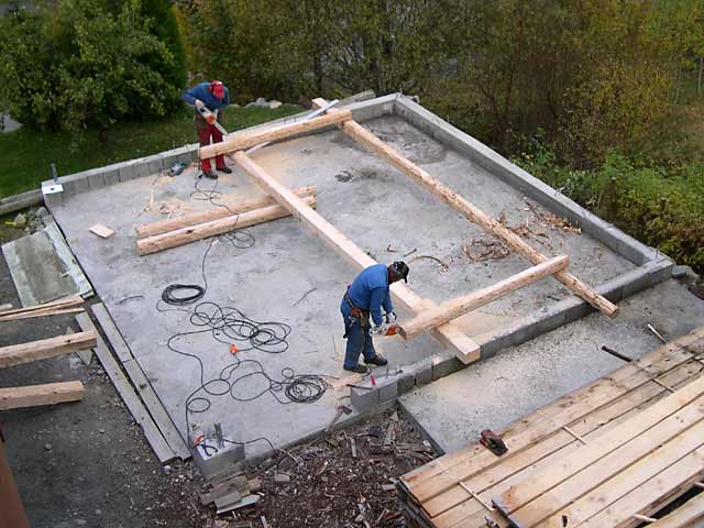 Skytjestavene er gamle impregnerte telefonstolper som er firkantskåret til ca 6 x 6 tommer. Torvhald og takrenner vil også bli laget av dette.Garasjen er dimensjonert for tung tekking og 300 kg snølast. Trolig kunne rafthaljene vært betydelig mindre enn det som var brukt her uten at det gikk ut over styrken.