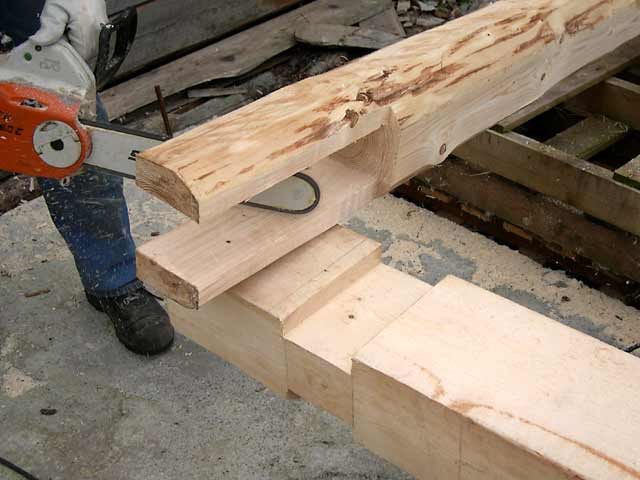 Careful chainsaw carving of post and beam before fitting.