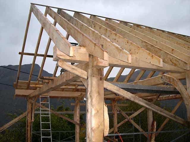 The roofbeams are resting on the longitudinal beams which in turn are supported by the top of the standing posts. The crossbeams are only taking up vertical strech caused by roof load in addition to their own weight. Additional bows will be fitted between til posts and the longitudinal beams to strengthen and stiffen the framework on both horisontal directions.