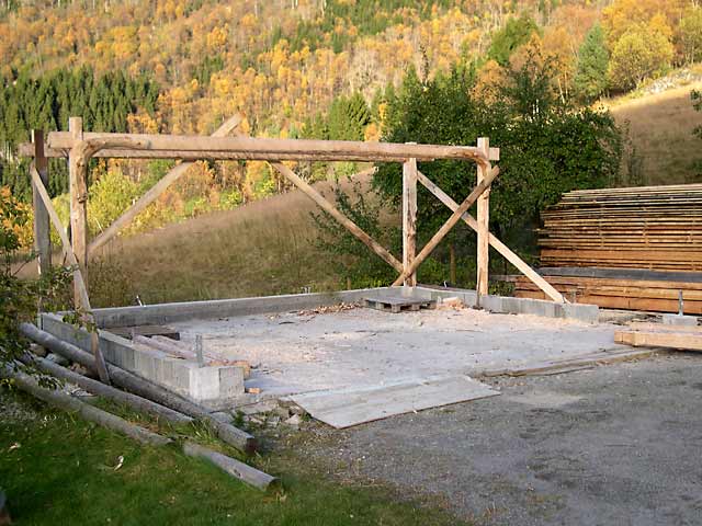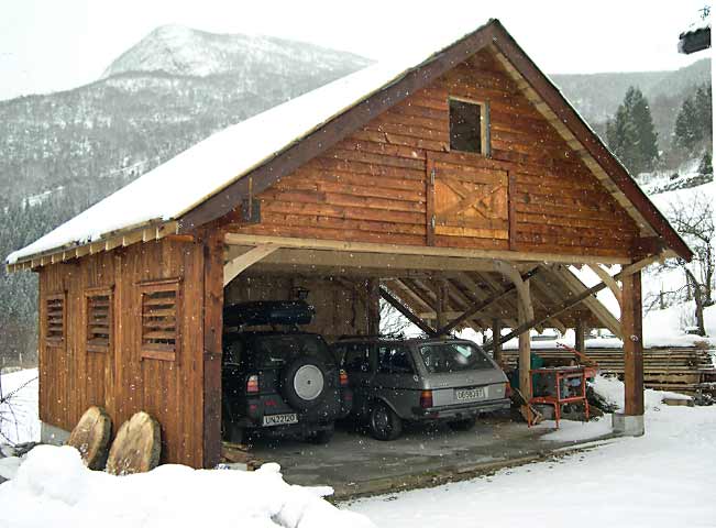 Garage for two cars and storage for fire wood built in grindverk construction. Westen Norwegische Ständerbau mit Saule und Kopfband für zwei autos.