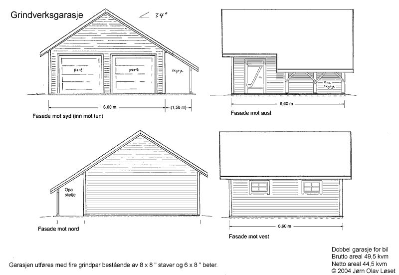 Grindverk garage for two cars The modular principle of norse framework construction makes this building easy to modify in width, depth and height. The garage shown here covers about 50 m².