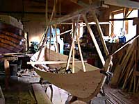 Arrangement for supporting the hull before the ribs are mounted. The boat is a færing from Sunnmøre during building. Crafter is Jakob S. Bjørkedal from Volda in Norway.