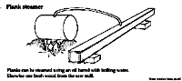 Stiff planks can easier be bent into shape after steaming. Steaming can be done easily by an arrangement of boiling water in an oil barrel, leading the steam through a pipe into a hollow profile of planks. If possible the hull should be built of "green" timber fresh from the saw mill or kept moist until builiding is done.