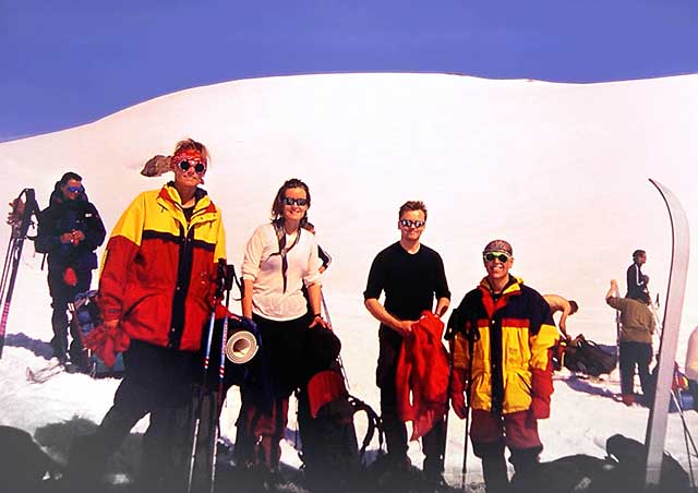 Supphellebreen er unnagjort. Heretter går det bratt nedover mot Flatbrehytta. Nedkjøringen til dette punktet er ganske tøff med tung sekk og støle bein. Derfor alle disse klærne tross det fine været. Fra venstre Tove, Rita, Dag Frode og meg (Jørn).