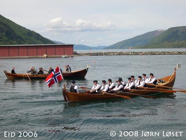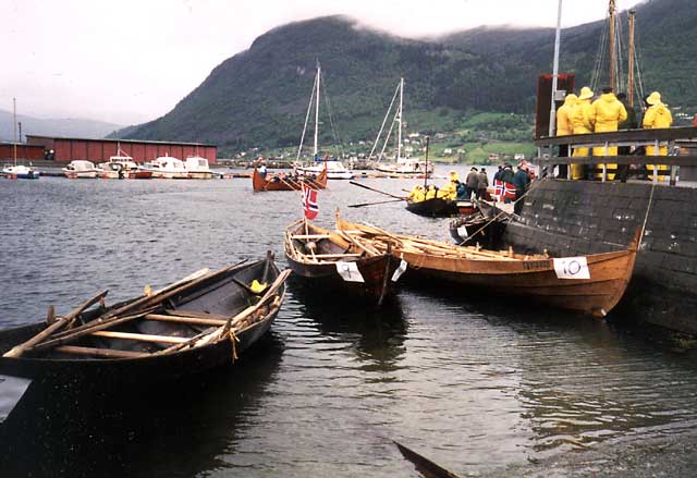 Rostevne på Bjørkedalen tidlig på '90-tallet. Disse rostevnene var forløperen til det som i dag er blitt til den Norrøne Kulturfestivalen på Nordfjordeid. Båten til venstre er "Bjarka" som flere ganger har tatt flere seire i roregatta i York i England. Båten til høyre er kopi av den lille Kvalsundbåten, der jeg selv var med som mannskap. Båten er slank og flott, rask og lettrodd, men noe ustabil. Picture from a rowing regatta in Bjørkedalen in the eary 90ties. The regatta was then later moved to Nordfjordeid. The boat at the left is "Bjarka" which has won the regatta in York several times. The other boat in a copy of the smaller Kvalsund boat. The boat is fast, but not very steady.