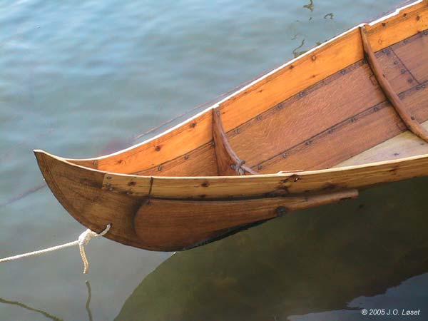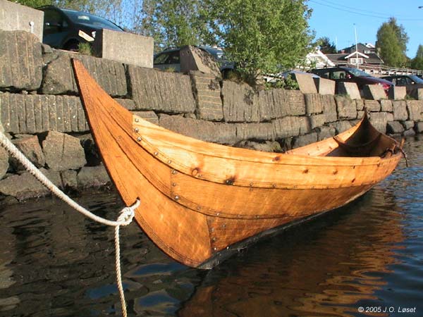quite fast in use, but not very durable in handling. The faering pictured above is a very fine replica of the Gokstad faering. Builder is Svein Erik Øya. It is as close as possible to the original in every detail. The boat is located in Sandefjord, Norway, were the Gokstad kystlag (The Gokstad ship guild) resides. The original small boats from the Gokstad ship find are exhibited at the Viking ship museum in Oslo together with the Gokstad ship. You can read more about the original Gokstad ship here >>. |