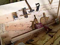 The nails are set from the outside and clinkered to their counterparts; the 'roves', on the inside. Drill pilot holes for the nails, and use a dolly in the inside while driving the nails through the strakes. Any excess length of the nail shaft is cut away and the rivet rounded by simultaneously hammering from each side, peening down the nail stub to a small lump which secures the rove.The following strakes are attached to each previous strake by overlapping about an inch, somewhat more in larger ships. The strakes are kept in position by supporting rods both before and after they are clinkered together. At this stage the hull is formed, 'laying out' the floor strakes in the bilge. The strakes are adjusted into position by supporting rods to the floor and to the beam above the boat (see illustration). The symmetry of each side has to be checked carefully, as any errors in shape are hard to correct later. On larger ships the sheer mass of the planks will make supporting rods on the upper side obsolete. When a new plank is finished on one side, it can be used as a template to mirror the corresponding strake on the opposite side. Sight along the edges of the subsequently fitted strakes to adjust for any bumps, cavities, hewing or fashioning the edge to ensure a smooth line before fitting the next strake.
