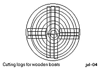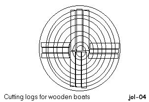 Supporting the keel is absolutely essential to maintain symmetry in the keel when the strakes are added. Any errrors here can't be undone later. The diagram for splitting the logs into planks provides a challenge for boats builders who are forced to buy industrially sawn materials. Oak can be split radially, while pine permits tangentially split timbers, avoiding the pith in the center. Thus, it is possible to obtain wider planks of pine from a log of the same diameter.