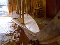 Arrangement for supporting the hull before the ribs are mounted. The boat is a færing from Sunnmøre during building. Crafter is Jakob S. Bjørkedal from Volda in Norway.