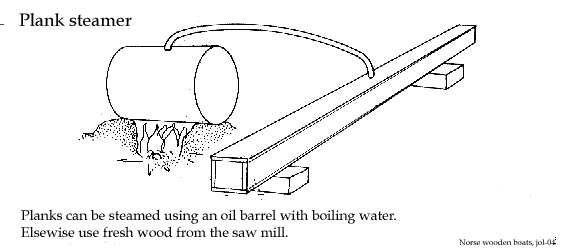 Stiff planks can easier be bent into shape after steaming. Steaming can be done easily by an arrangement of boiling water in an oil barrel, leading the steam through a pipe into a hollow profile of planks. If possible the hull should be built of "green" timber fresh from the saw mill or kept moist until builiding is done.