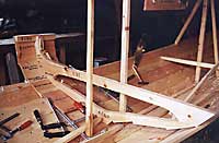 The keel is cut and planed into its T- or Yshape and levelled onto temporary wooden blocks fastened to the floor in the workshop. The measures of the keel is of couse according to the chosen boat design. The keel must be cept firmly in position. It should be made from dry and 'dead' wood to prevent deformations during the construction, and, of course, be absolutely straight as seem from above. Some Viking ships, as the Oseberg ship, have a rockered keel, which means that the keel have to be fashioned into a curve before any strakes can be fitted. Many crafts also sported shallow false keels (on. 'drag') to protect the keel and bows from wear after repeated beachings. Attach the false keel now, if it was present originally.