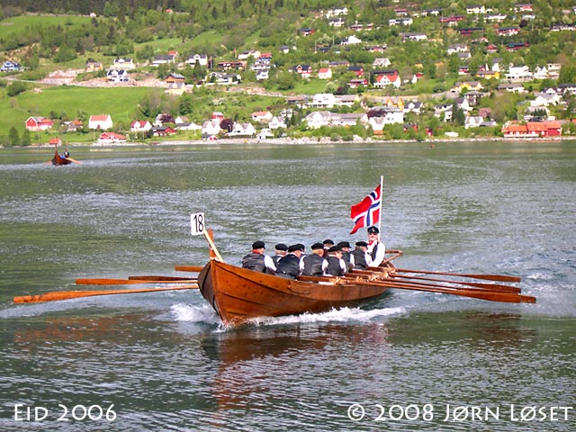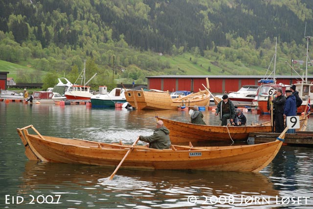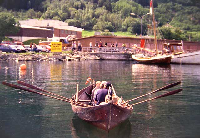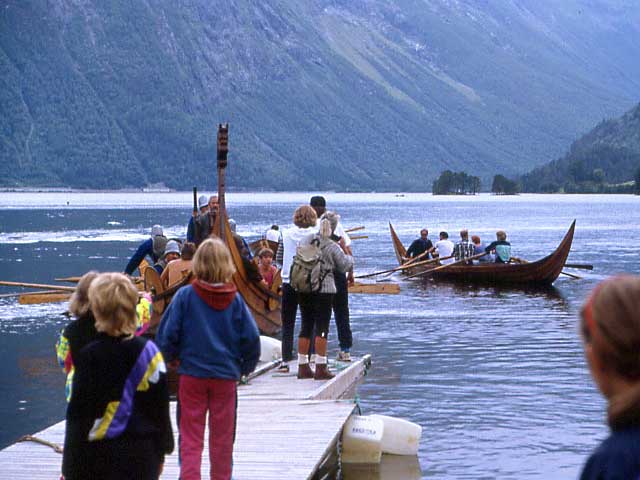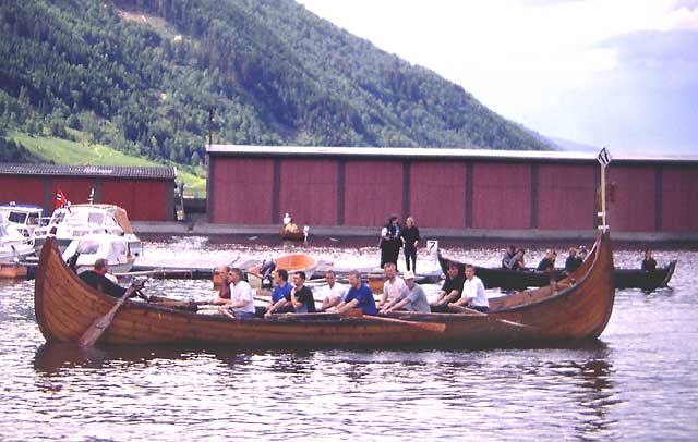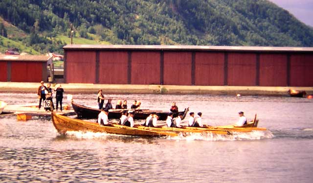 Rostevne på Bjørkedalen tidlig på '90-tallet. Disse rostevnene var forløperen til det som i dag er blitt til den Norrøne Kulturfestivalen på Nordfjordeid. Båten til venstre er "Bjarka" som flere ganger har tatt flere seire i roregatta i York i England. Båten til høyre er kopi av den lille Kvalsundbåten, der jeg selv var med som mannskap. Båten er slank og flott, rask og lettrodd, men noe ustabil. Picture from a rowing regatta in Bjørkedalen in the eary 90ties. The regatta was then later moved to Nordfjordeid. The boat at the left is "Bjarka" which has won the regatta in York several times. The other boat in a copy of the smaller Kvalsund boat. The boat is fast, but not very steady.