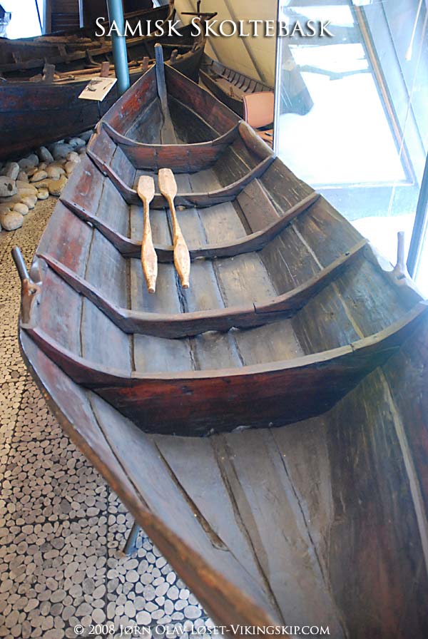 Østsamisk skoltebask fra Petsamo, brukt i elver og til fjordfiske i Finnmark.L=4,85, B=1,32 m. Bygd ca 1900. Kilde Norsk Sjøfartsmuseum.