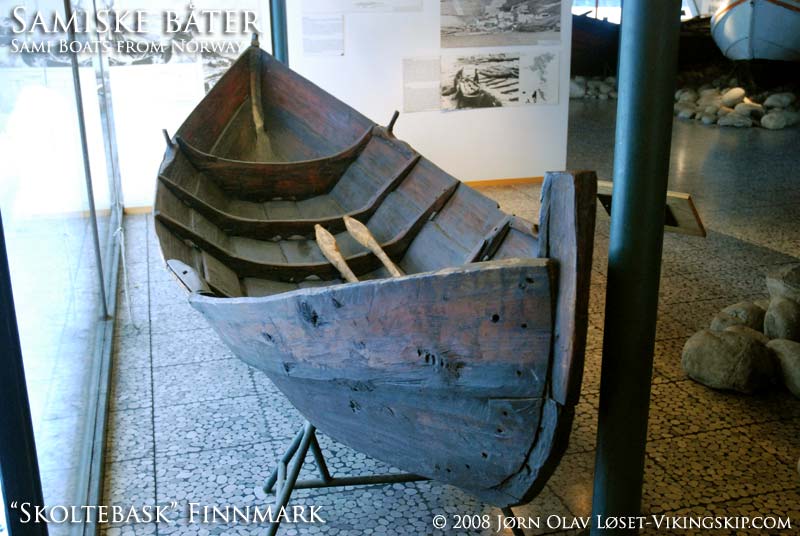 the Scandinavian arctic At first I concidered to make a separate page about the Sami boat types, but I soon realized that Sami boatbuilders were so involved in building the common Nordland boat that it is rather pointless to distinguish the Sami boat builders from other boat builders in northern Norway. They were just as good boat builders as anyone else up north, usinge the same tools and procedures, including blacksmithing and iron clinkering the hulls. However, some certain boat types seem to have been built solely by the Sami's, and are closely connected to the Sami's way of life in the arctic regions in Scandinavia. They are mainly simple, light and unrigged crafts that were suited to the broad rivers in Finnmark and the Kola peninsula, where the rivers are reknowned for their rich populations of atlantic salmon and sea trout. Elvebask - sami river boats in Finnmark The "elvebask", meaning "riverboat", are oblong and light boats that are specially adapted to use in shallow rivers with moderate to strong currents. They have a broad keel plank, rather than a real keel, which makes the boats easy to land on river banks and prevents that the hull is caught by sudden cross currents. A Sami river boat with two pairs of oars could be 9 to 10 meters long and a beam of about 1 m. A long and open room aft in the boat was a compartment for cargo and fishing gear. Modern Sami river-basks are usually converted to or built for fitting an outboard engine. Skoltebask - Eastern Finnmark / Kola peninsula, Russia / Northern Finland The Skolte sami's are a subgroup of the