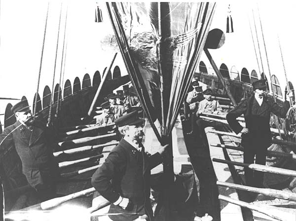 Capt. Magnus Andersen onboard in 1893. Andersen is holding the banner with a raven, which has lead to the frequent misunderstanding about the name of the vessel.( He's not holding the square sail. )
